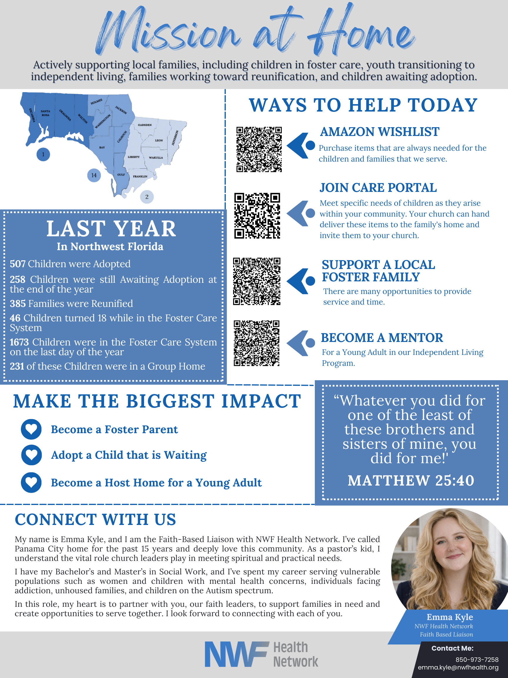 To strengthen collaboration with churches and faith-based organizations, we established a dedicated Faith Liaison role. This position serves as the primary point of contact for faith partners across our service region, building bridges and advancing our shared mission of care and compassion.